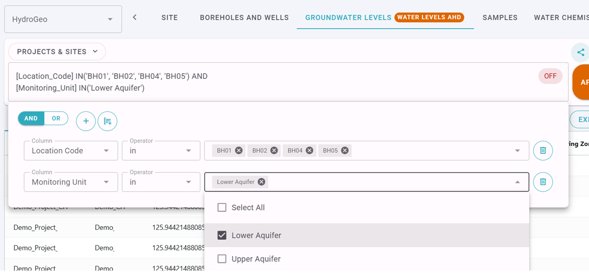 Users can pick from the available Data Types along the top. Each Data Type has one or more Views which combine data from different tables and apply logic, such as showing Water Levels as Depths, or above the Height Datum (AHD).