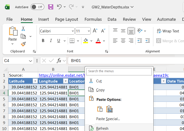 Data exported to Excel can retain a connection to ESdat using the OData protocol, allowing users to use the "Refresh" option in Excel to update the data without having to re-export it from ESdat, as shown below.