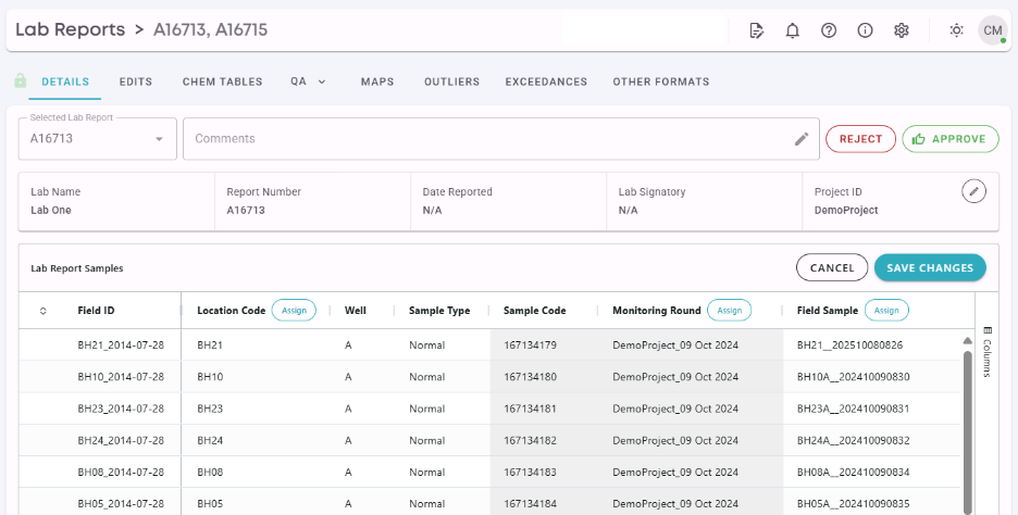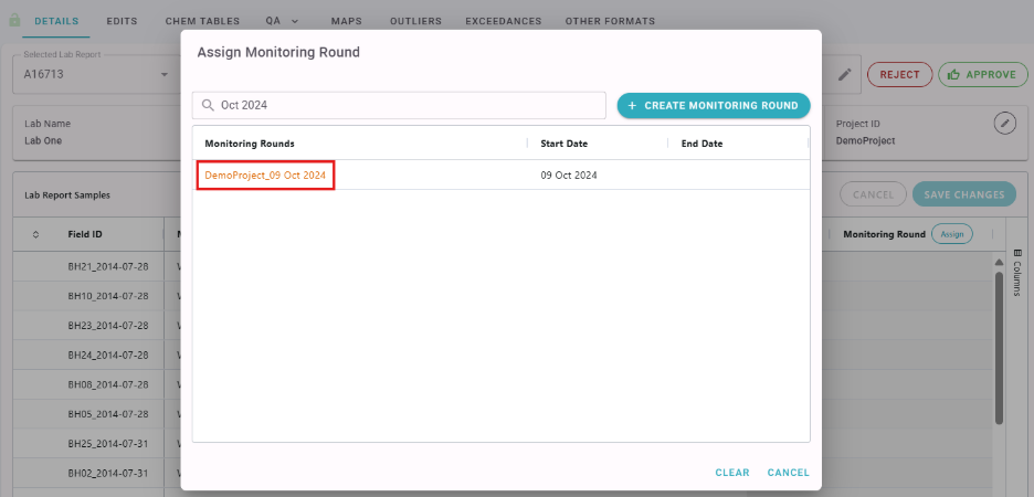 To do this, you will need to assign the lab samples and results to the monitoring round that has the field data under the lab report’s details page.