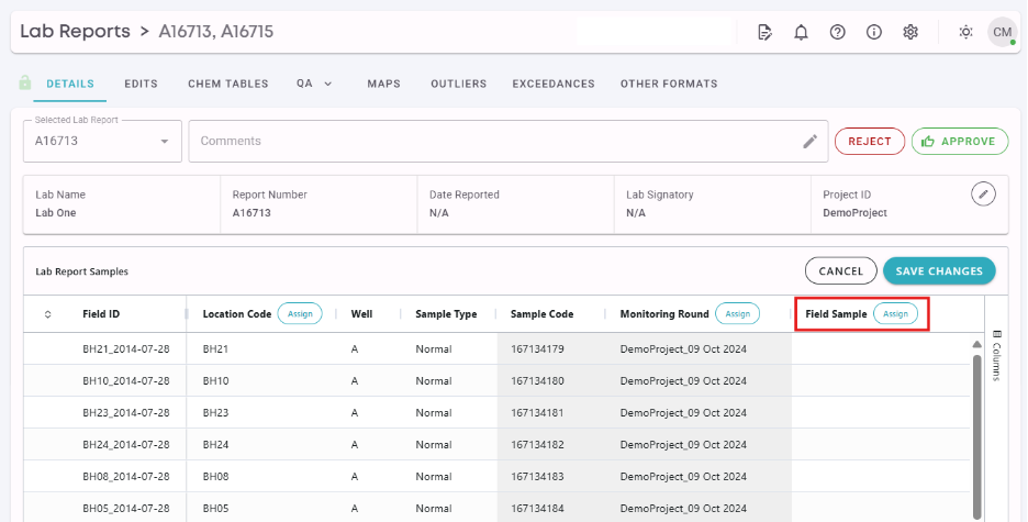 Clicking on the "Assign" button will automatically assign the field samples inside the selected monitoring round based on the location code, sampled date, and well.